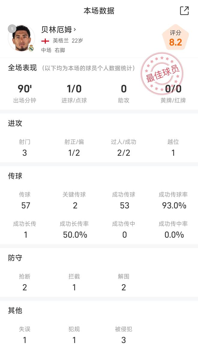 雷速体育10月23日讯 在今天凌晨结束的皇马主场1-0尤文的欧冠比赛中,贝林厄姆打入制胜球帮助皇马力克尤文。