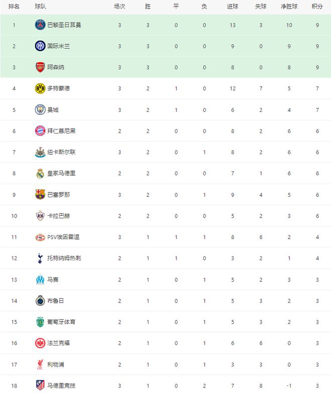 随着巴黎7-2+巴萨6-1,阿森纳4-0马竞,欧冠最新积分榜:榜首易主