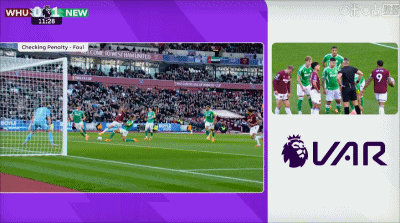 第12分钟,鲍恩禁区内倒地,主裁判观看VAR后取消点球判罚